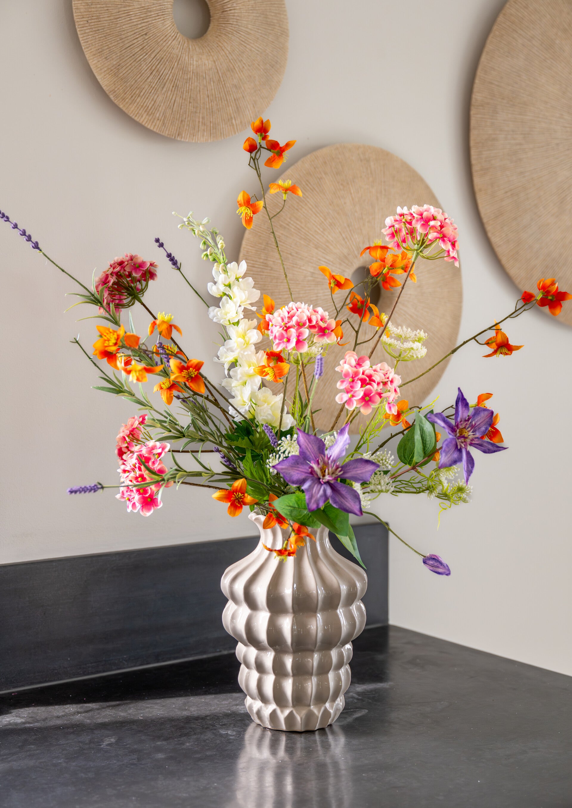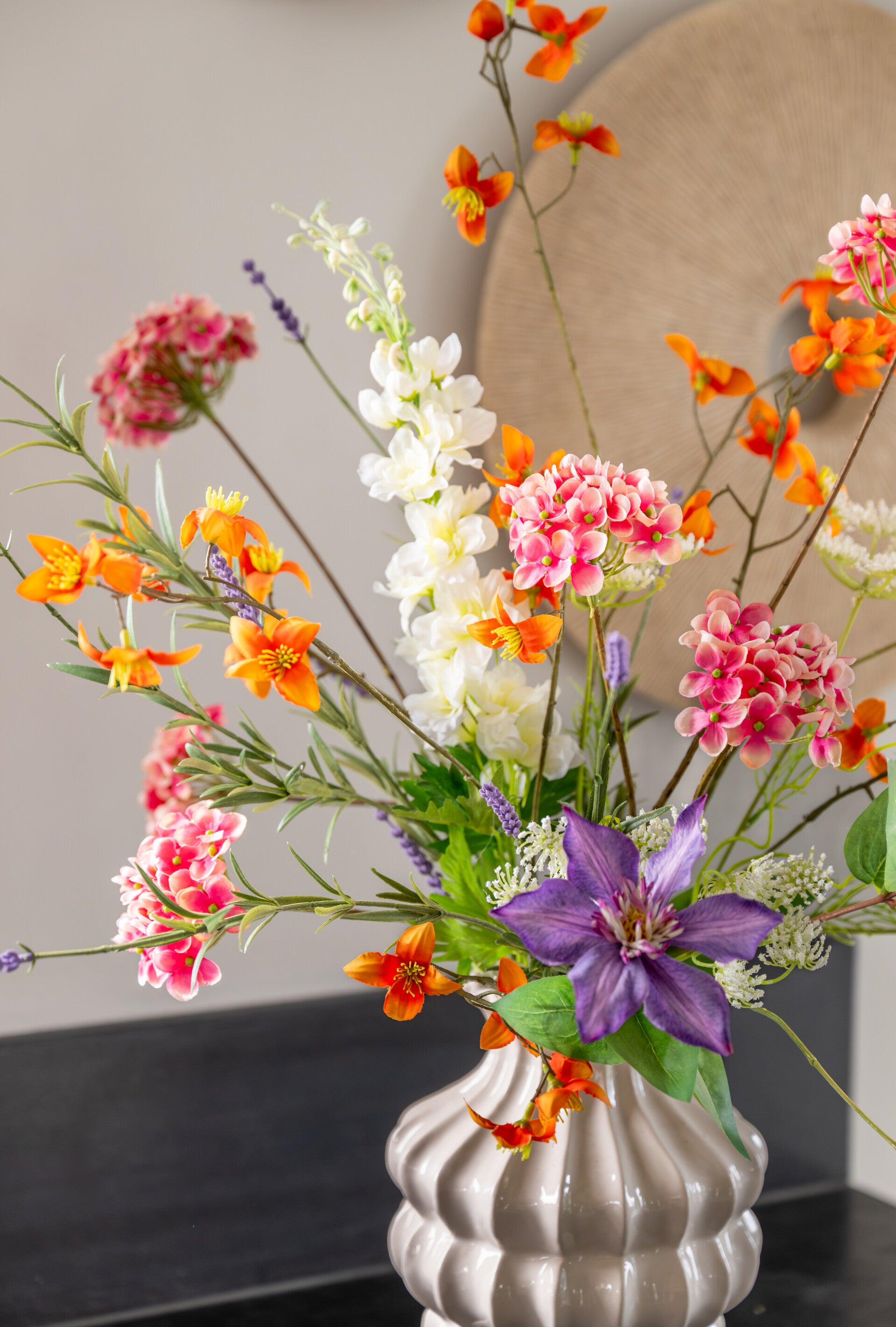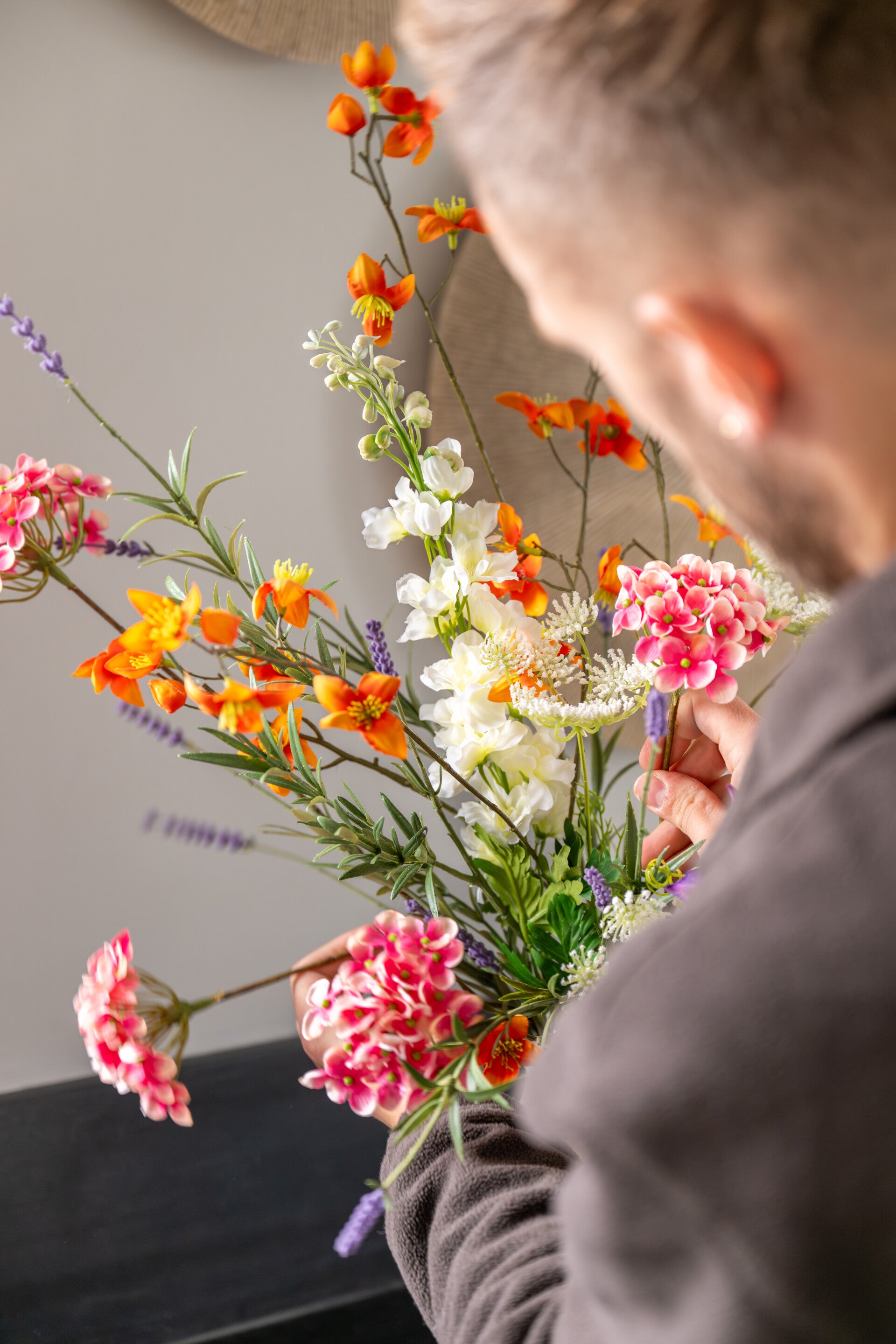 Zijden boeket klein paars/oranje/wit